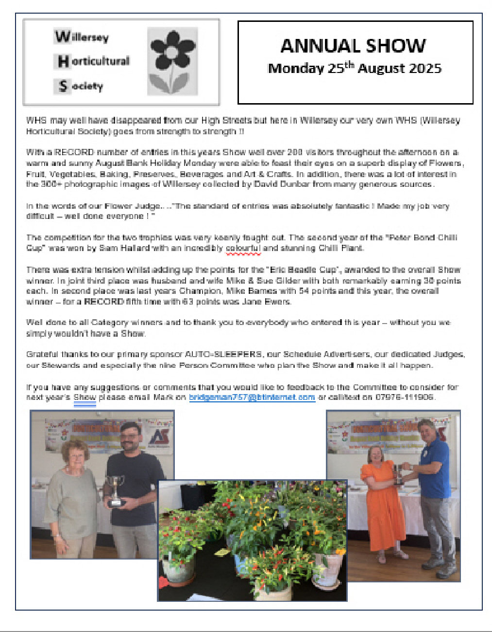 * The Eric Beadle Cup for the best total exhibits at the Show was awarded to Jane Ewers.