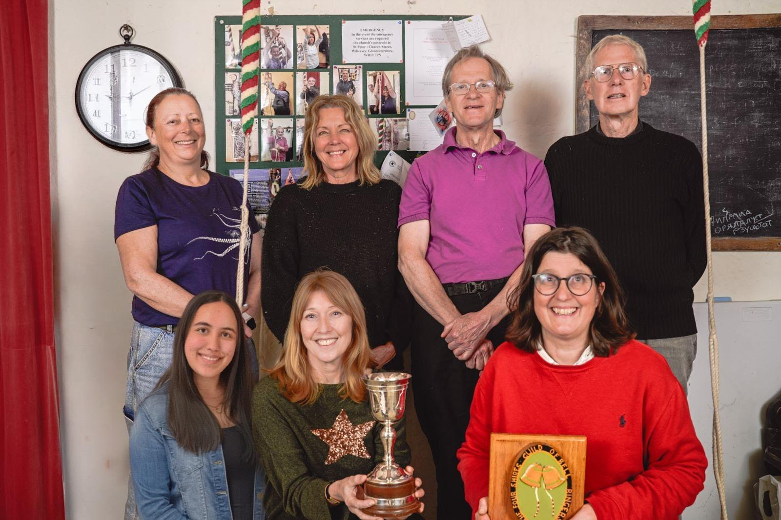Willersey St Peter's bell ringing team celebrate a superb second place in this year's Four Shires Newing Shield, alongside a Tower Merit Award recognising the tower's outstanding year.